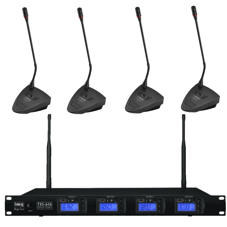 One 4-channel IMG Stageline TXS-646 multi-frequency receiver unit with UHF PLL technology 672.000-696.975MHz and four TXS606DT desk paging transmitters.