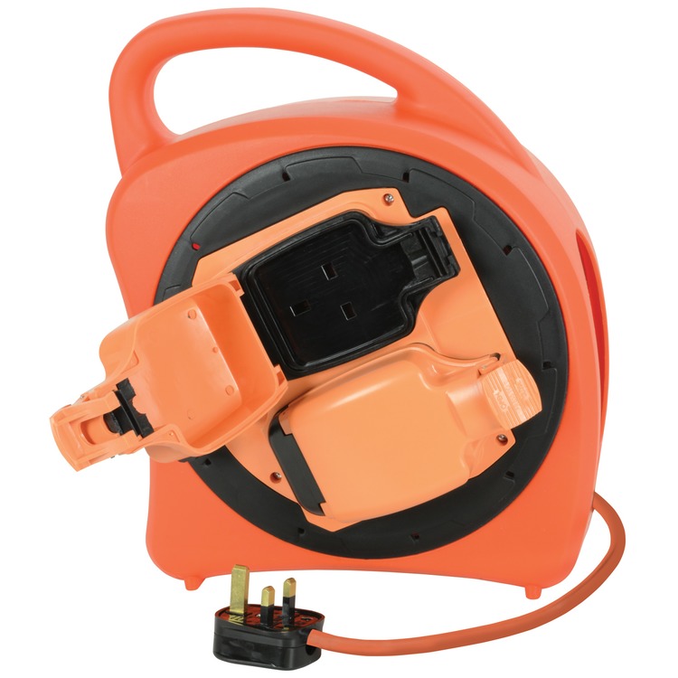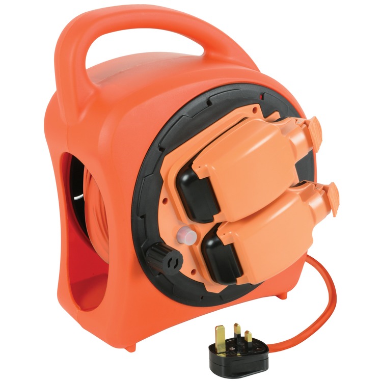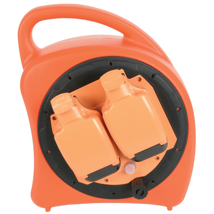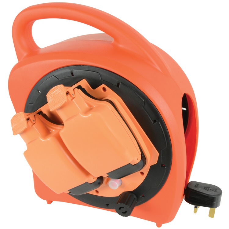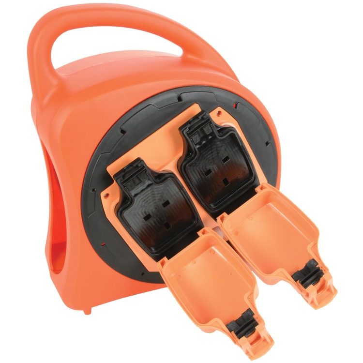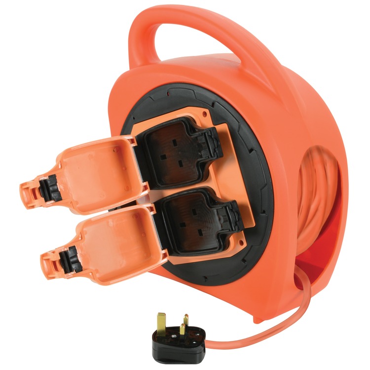 A tough and durable, weatherproof mains extension reel with 2 enclosed mains sockets, thermal cut out and high visibility cable. The 2 splashproof sockets are IP54 rated and provide a safe and convenient temporary outdoor power solution.