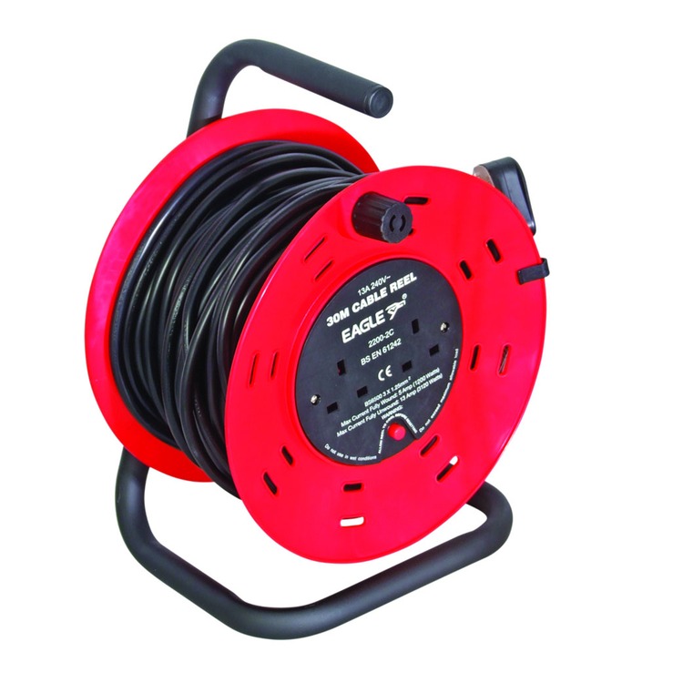 A Red and Black 2 Gang 30 m extension reeler with stand, carry handle and reset button. Maximum current when fully wound is 5 A. Maximum current when used fully unwound is 13 A.