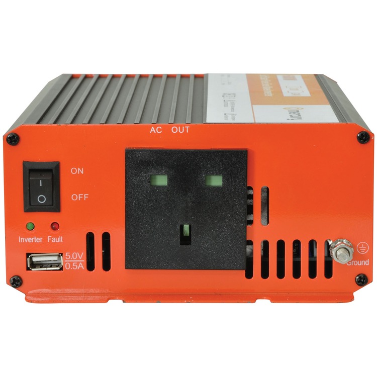 This 600W high efficiency power inverter uses a pure sine wave main to power 230V mains equipment and a 1000mA USB socket from a 12V battery or DC power supply.